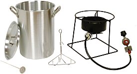 The King Kooker 12 inch Welded Propane Outdoor Cooker lets you fry up to an 18-lb turkey. It features an aluminum 26-qt turkey pot with a turkey rack and a lifting hook. It also comes with a deep fry thermometer.